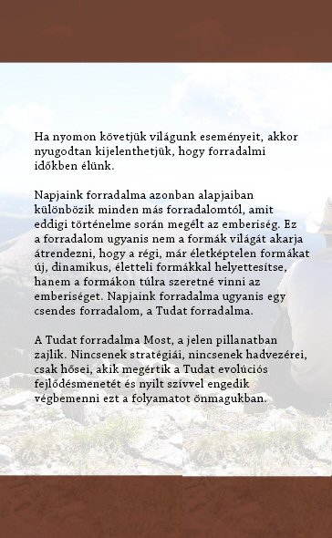Ez a forradalom ugyanis nem a formák világát akarja átrendezni, hogy a régi, már életképtelen formákat új, dinamikus, életteli formákkal helyettesítse, hanem a formákon túlra szeretné vinni az emberiséget. Napjaink forradalma ugyanis egy csendes forradalom, a Tudat forradalma.